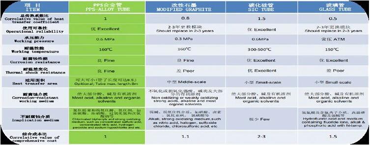The comprehensive operating cost of PPS-alloy heat exchanger is lower than graphite, silicon carbide and metal matrial type as such list.